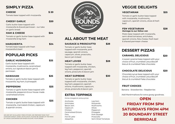 ‘Out of Bounds Berridale Pizza' is our dream, and we are so happy it’s been such a welcome addition to Berridale. We are passionate about our little village, and the Snowy Mountains in general, and want to provide a place where locals and visitors alike can expect consistency in quality, value, and availability. As the town grows we hope to see many faces, both new and familiar, enjoying our carefully crafted wood-fired pizza. So what are you waiting for, take a load off and let us cook dinner for you tonight!